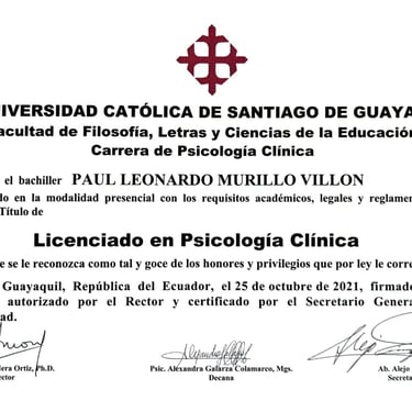 Psicólogo clínico graduado de la Universidad Católica de Santiago de Guayaquil. Atiendo a niños, adolescentes y adultos en mi consultorio particular. Trabajo con instituciones educativas y empresas promoviendo la diversidad humana y la salud mental desde un enfoque empático.